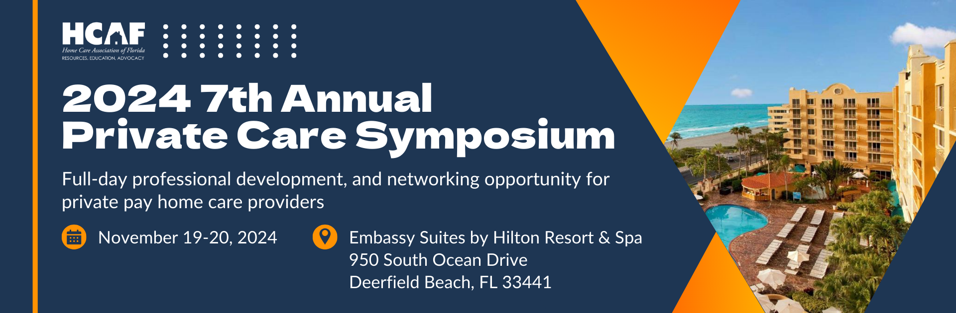 Experience a full day of professional growth and inspiration at the 7th Annual Private Care Symposium on November 19-20, 2024, in Deerfield Beach. This premier event, designed exclusively for private pay home care providers, promises a day of insightful professional development. Begin your experience with a welcoming evening reception on Tuesday, November 19, followed by a full day of enriching sessions and invaluable networking on Wednesday, November 20. Don’t miss the opportunity to connect with and learn from distinguished industry leaders and influencers. Register now to secure your spot at this must-attend event!