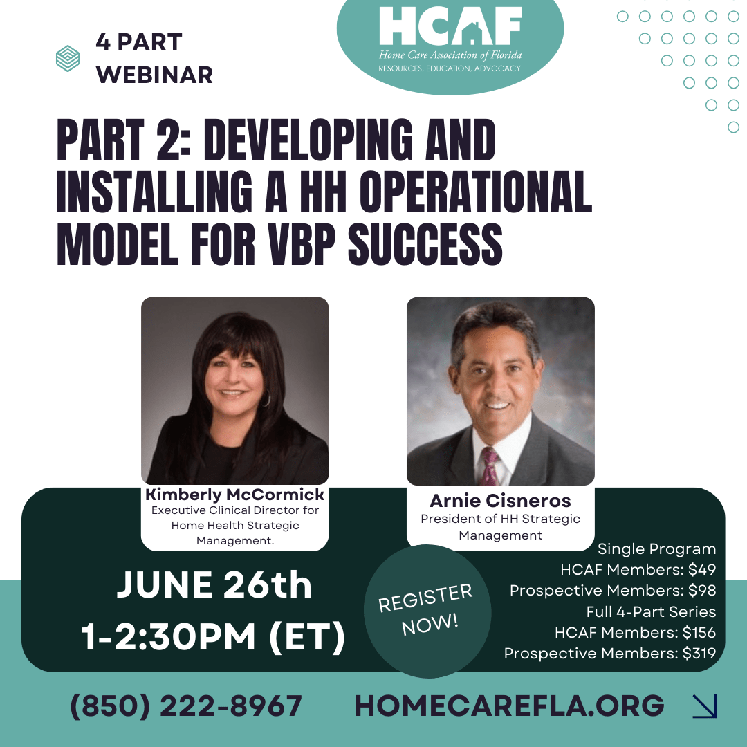 With a Value-Based HH platform as the basis of your care production, care delivery, and patient satisfaction programming, you will be on the path for VBP-qualified outcomes. In addition, you will be prepared for success under the subsequent Impact Act HH reforms, including PAC PPS. Don’t miss this essential webinar series and start preparing for VBP success today.