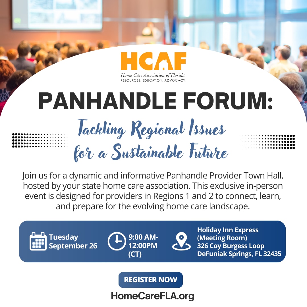Join us for a dynamic and informative Panhandle Provider Town Hall, hosted by your state home care association. This exclusive in-person event is designed for providers in Regions 1 and 2 to connect, learn, and prepare for the evolving home care landscape.