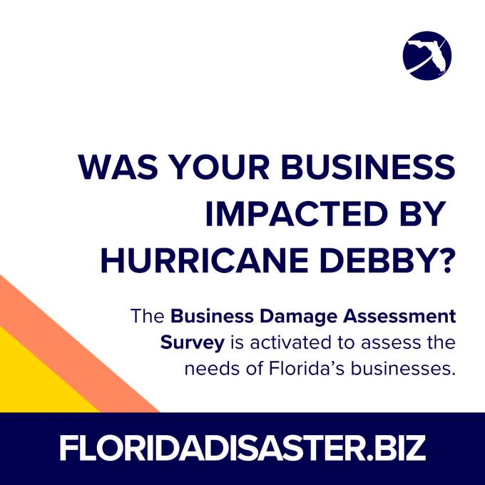 Business owners are encouraged to self-report any physical and economic damage caused by Hurricane Debby through this survey. Those with physical business locations should ensure this information is shared with the relevant business owners. The survey responses will assist in expediting recovery efforts by collecting data and assessing the needs of impacted businesses. You can complete the survey online at FloridaDisaster.biz by selecting "Hurricane Debby" from the Event/Incident dropdown menu to report damage related to the storm.
